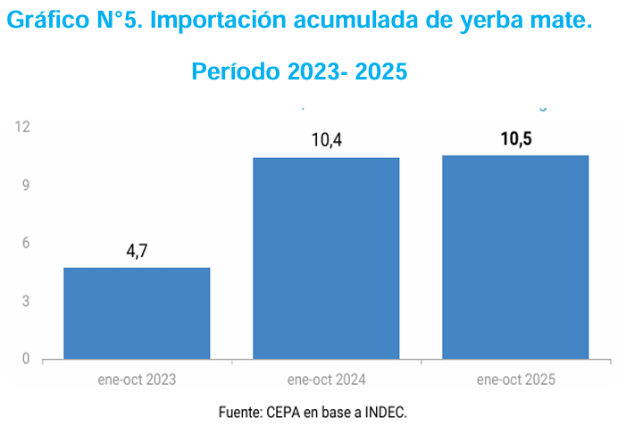 “Las importaciones de yerba pasaron de los 4,7 millones de kilos entre enero y octubre del 2023, a los 10,4 millones en el mismo período de 2024. Esto representa un incremento del 221,3% interanual. Durante el 2025, la cantidad importada es similar a la del 2024, 10,5 millones de kilos, presionando aún más a la baja el precio local”, puntualizaron.