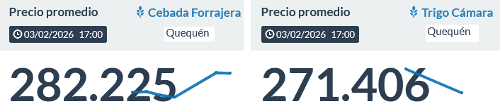 El valor promedio de la cebada forrajera negociado hoy con entrega en las terminales de Quequén se ubicó en 282.225 $/tonelada (193,3 u$s/tonelada al dólar MEP) luego de registrar un máximo de 288.800 $/tonelada el pasado 14 de enero, según datos de Sio Granos. En tanto, el valor del trigo pan condición cámara en ese mismo destino fue de 271.406 $/tonelada.