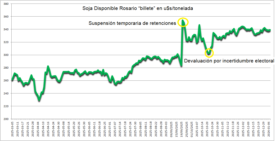 Con un precio de la Soja Rosario Enero 2026 cotizando este jueves en 348,5 u$s/tonelada, la ventana comercial de la soja “vieja” no debería extenderse más allá de abril próximo, dado que la presión de cosecha de la soja 2025/26 tenderá a promover una caída de los valores de poroto.