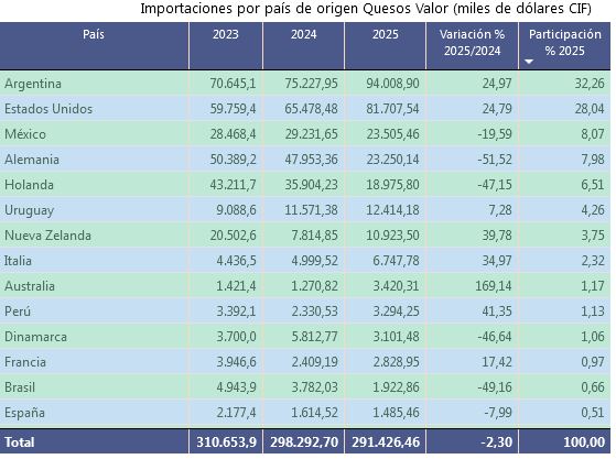 Sin embargo, el tercer lugar en importancia es para la UE-27. Las exportaciones de quesos a Chile –que sumaron un total de 57.225 toneladas por 94,0 millones de dólares CIF en 2025– fueron ocupadas en un 19% por Alemania, Países Bajos, Italia, Dinamarca, Francia y España.