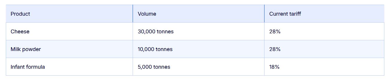 Esa es la razón por la cual el acuerdo contempla una cuota anual de 30.000 toneladas de quesos, 10.000 de leche en polvo y 5000 de fórmulas infantiles, la cual comenzará a aplicarse de manera gradual hasta alcanzar un arancel del 0%.