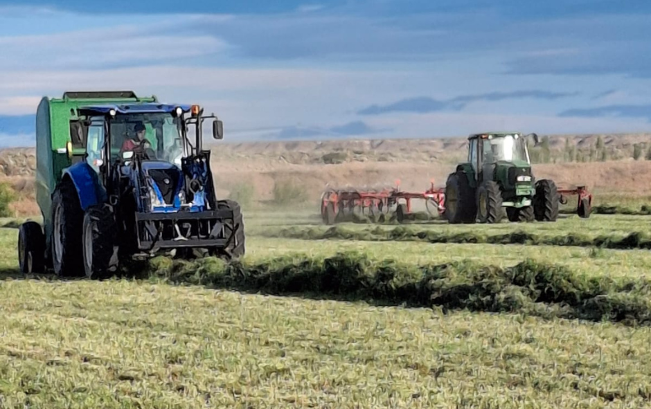 Actualmente trabaja con cuatro equipos de tractores equipados con palas niveladoras, sistemas de nivelación por GPS y algo de tecnología láser. En alfalfa, la superficie varía año a año: prestan servicios sobre unas 400 hectáreas y producen unas 130 hectáreas propias con dos equipos en funcionamiento. Todo esto se complementa con una chacra hortícola de 75 hectáreas.