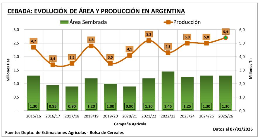 Esta semana finalizó la cosecha argentina de cebada con un total estimado en 5,4 millones de toneladas, una cifra 14% superior al promedio del último lustro y la más elevada de la última década.
