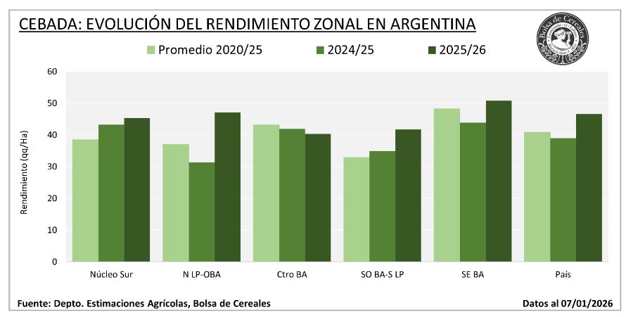 El rendimiento promedio nacional finalizó en 46,6 qq/ha, el cual fue posible por la marca media de 51,0 qq/ha lograda en la región sudeste de Buenos Aires, la principal zona productora de cebada del país.