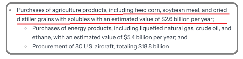 Además de la eliminación o reducción de barreras arancelarias para productos agroindustriales estadounidenses en los cuatro países, el aspecto más relevantes es que Tailandia se comprometió a importar maíz, burlanda de maíz y harina de soja de EE.UU. por una suma de 2600 millones de dólares anuales.