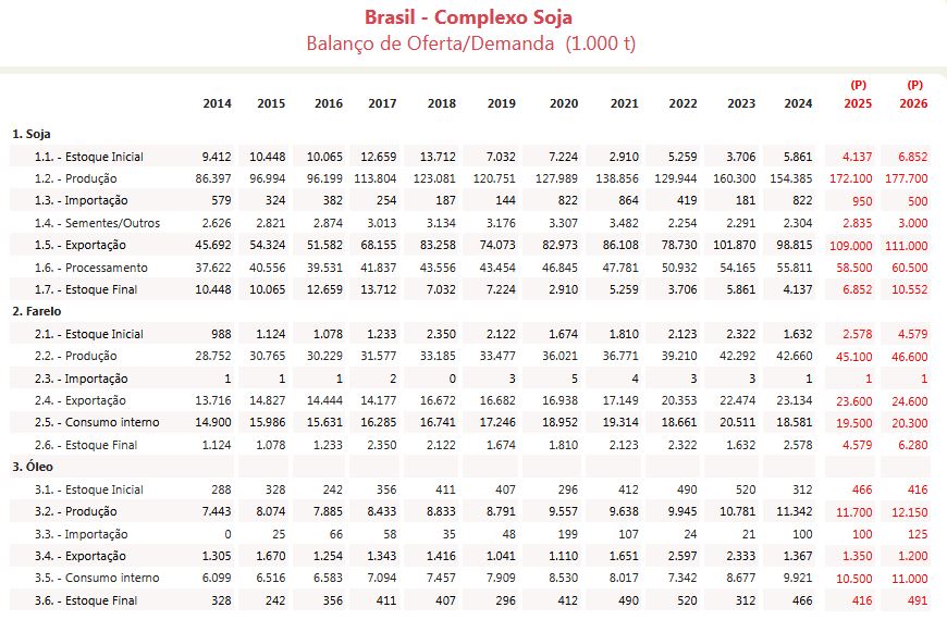 En lo que respecta a las exportaciones de poroto de soja, Abiove espera en 2026 una cifra récord de 111,0 millones de toneladas versus 109,0 millones en 2025, mientras que la molienda llegaría a los 60,5 millones de toneladas para fabricar 46,6 millones de toneladas de harina de soja, de las cuales 24,6 millones tendrían como destino el mercado externo.