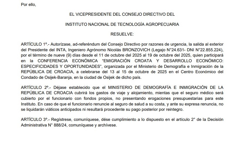 El presidente del INTA, Nicolás Bronzovich, está de viaje en la tierra de sus ancestros, Croacia, participando de una conferencia que casi nada tiene que ver con su tarea oficial al frente del organismo tecnológico: participa de una conferencia sobre la “emigración croata y el desarrollo económico”.