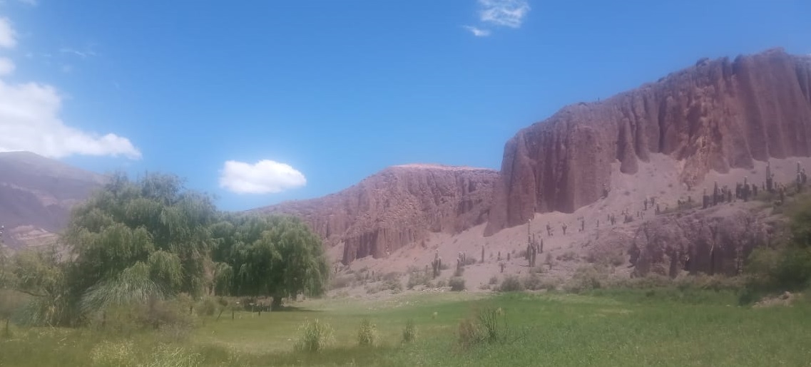 Es El Gólgota un punto de inflexión para la geografía y el ambiente de la quebrada, donde se ensancha el horizonte, y la merma de la vegetación deja entrever los suelos amarillos y arenosos de la Formación Yacoraite. “Tenemos un paisaje muy variado que empieza con un alisal, a la salida de Quijano y, a medida que va subiendo, esa vegetación va disminuyendo y se deja ver la piel de las montañas y sus colores que va cambiando constantemente. Todo se va matizando con sus distintos paisajes de potrero y de cerros pintados, cerros áridos, zonas de muchos cardones”, ilustra Alicia.