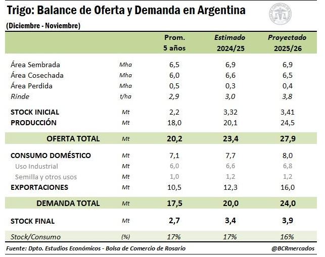 Esta semana se largó oficialmente la campaña comercial 2025/26 de trigo en la Argentina con estimaciones récord de producción de entre 24,5 millones de toneladas (Bolsa de Comercio de Rosario) y 25,5 millones (Bolsa de Cereales de Buenos Aires.