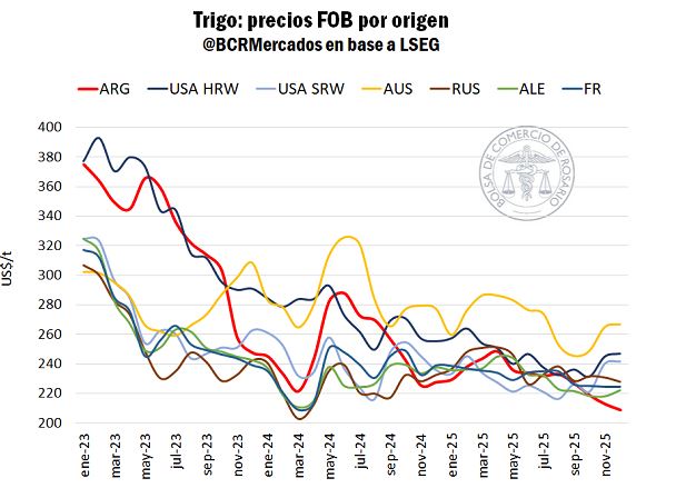 Por el lado de la proteína, los precios de exportación llegan a distanciarse en unos 10 u$s/tonelada comparando un mismo mes de entrega. “El FOB de diciembre 2025 para embarcar desde el Gran Rosario se negocia en 195 u$s/tonelada para trigo con un nivel de proteína del 10,5% y en 205 u$s/tonelada con un nivel de proteína del 11,5%. Inclusive se han llegado a ver ofertas vendedoras para trigo con proteína 12,5% en diciembre por 210 u$s/tonelada.