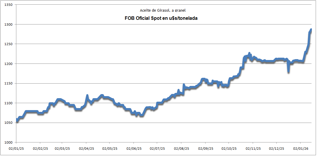 En lo que respecta al aceite de girasol en bruto a granel, el FOB oficial publicado por la Secretaría de Agricultura se encuentra en 1288 u$s/tonelada versus 1213 y 1207 u$s/tonelada uno y dos meses atrás respectivamente.