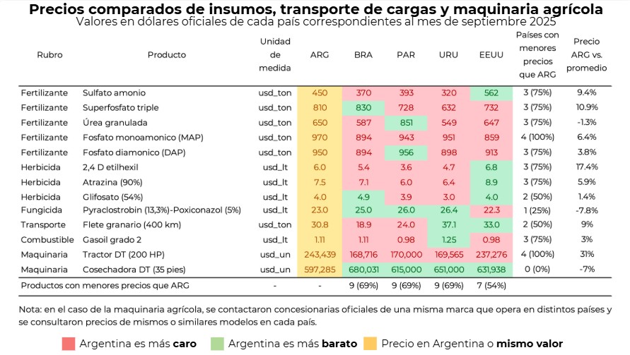 El estudio comparó seis grupos de bienes -fertilizantes, herbicidas, fungicidas, transporte de carga, combustible y maquinaria- y los resultados son arrojan que Argentina fue más cara en el 69% de los casos frente a sus vecinos regionales, y en el 54% frente a Estados Unidos.