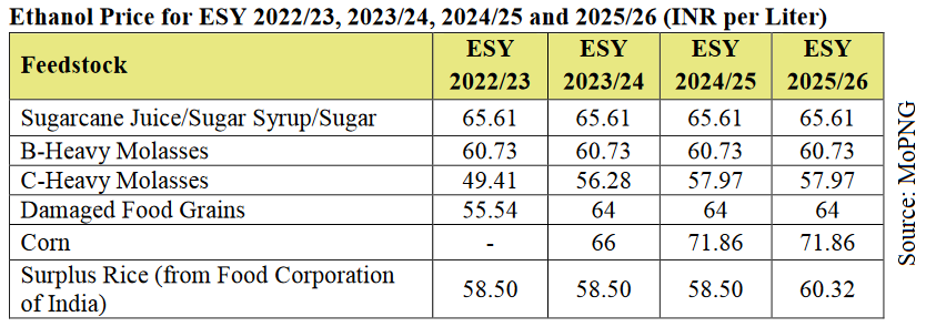 Para promover la producción de maíz, el gobierno aumentó el incentivo para el bioetanol maicero de 66,0 rupias por litro en 2023/24 a 71,8 rupias por litro a partir de 2024/25. También aumentó el precio mínimo de apoyo del maíz a 2400 rupias por quintal.