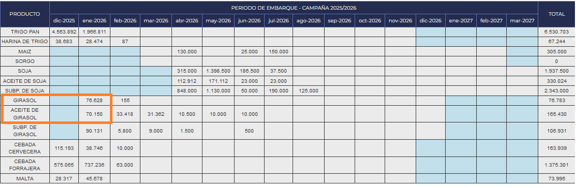 Las Declaraciones Juradas de Ventas Externas (DJVE) de semilla de girasol para este mes de enero suman 76.638 toneladas, mientras que las de aceite de girasol son hasta el momento de 70.150 toneladas. En enero de 2025 esa proporción era de 4930 toneladas de semilla y 58.389 toneladas de aceite.