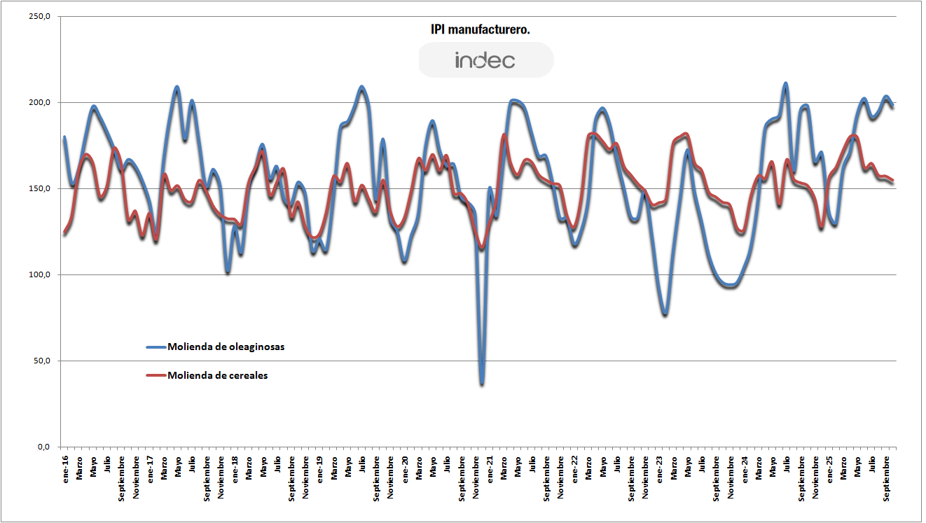 El nivel de actividad de la industria oleaginosa argentina se recuperó luego de experimentar un bajón a mediados del presente año. El último dato oficial disponible indica que en octubre pasado fue un 0,3% superior al del mismo mes de 2024, mientras que el acumulado de los primeros diez meses del año arroja una suba del 5,1% (por encima del promedio del 3,0% del rubro de alimentos y bebidas).