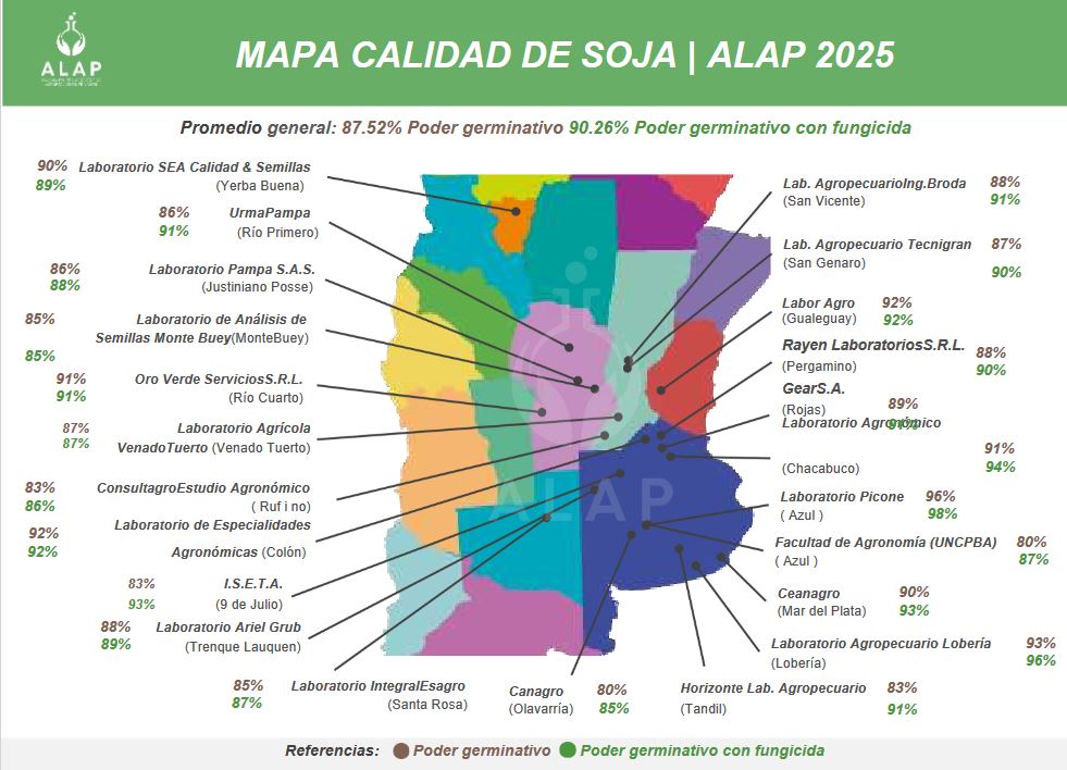 En el caso de la semilla curada, ALAP registró en 2025 que con el uso de curasemillas se logró una media a nivel nacional del 90,2%, una cifra cinco puntos superior al umbral mínimo de 85% que se recomienda para sembrar soja.