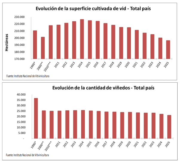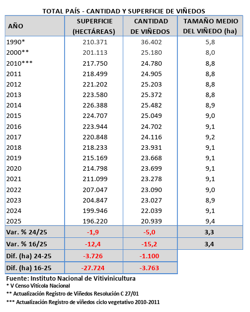 Actualmente, la superficie total de vid en el país ronda las 196.220 hectáreas, distribuidas en 20.939 viñedos. Respecto al 2024, el achique se dio en 3.726 hectáreas y 1.100 viñedos.