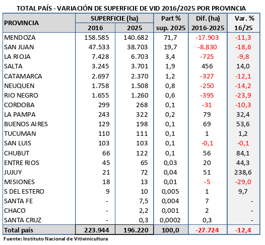 Respecto al achicamiento de la superficie por provincia, en la última década Mendoza acusó 17.903 hectáreas menos, seguida por San Juan, con -8.830; La Rioja, con -725; Río Negro, con -395; Catamarca, con -327; y Neuquén, con -250 hectáreas.