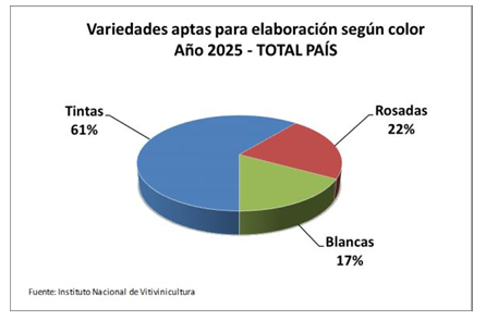 En cuanto a las variedades, en el país hay 185 implantadas, de las cuales 122 tienen aptitud para elaboración de vinos y/o mostos (180.318 ha). De estas 122 variedades (91.9% de la superficie), hay 52 que concentran el 76.7% de la superficie total son consideradas de alta calidad enológica (ACE) aptas para elaboración de vino con denominación de origen. El 8% restante son variedades aptas para consumo en fresco y/o pasas.