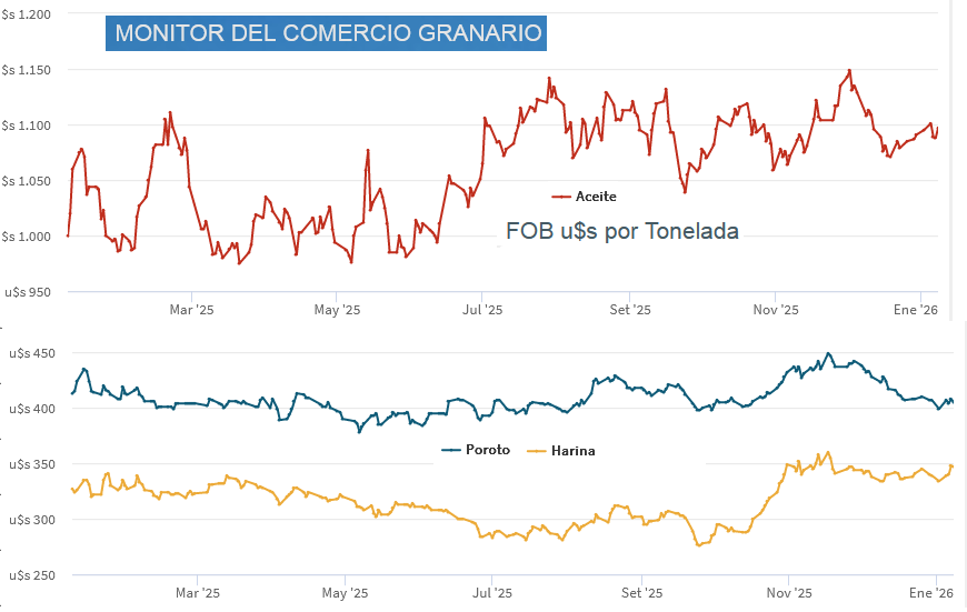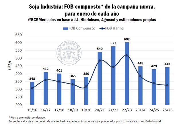 El FOB compuesto o precio de exportación promedio ponderado de la industria de soja argentina para la campaña 2025/26 es un 3% más elevado que el año pasado y está en un nivel similar al registrado en la campaña 2023/24.