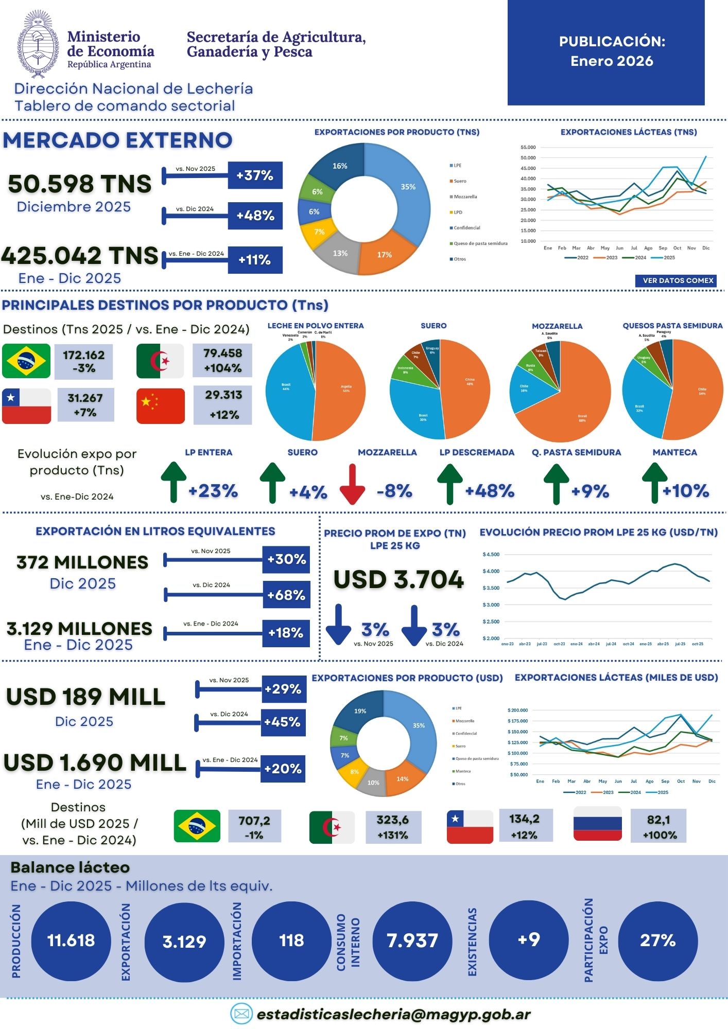 “En litros equivalentes, se exportó un total de 3.129 millones de litros (un 18% más que en 2024), representando el 27% de la producción nacional de leche, lo que refuerza este destacado año”, sostuvo Agricultura.