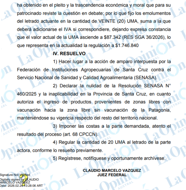 El magistrado aclaró que no sostiene que la Resolución 460/2025 carezca de fundamento para todo el país. No obstante, determinó que su implementación en la región patagónica, especialmente en Santa Cruz —zona libre de fiebre aftosa sin vacunación—, no está suficientemente respaldada considerando la importancia sanitaria y económica de mantener dicho estatus diferencial.