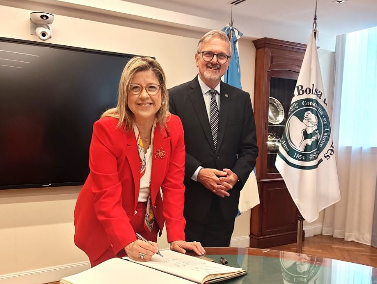 La funcionaria fue recibida por las autoridades de la Bolsa de Cereales: Ricardo Marra, presidente; Daniel Asseff, vicepresidente primero; Luis Zubizarreta, vicepresidente segundo; Diego Cifarelli, Tesorero; Ariel Landoni, prosecretario; María Marta Rebizo, protesorera; y Ramiro Costa, gerente de Estudios Económicos de la entidad. También participaron Marcos Hermansson, presidente del Centro de Corredores, y Jorge Lasalvia, gerente de la misma institución.