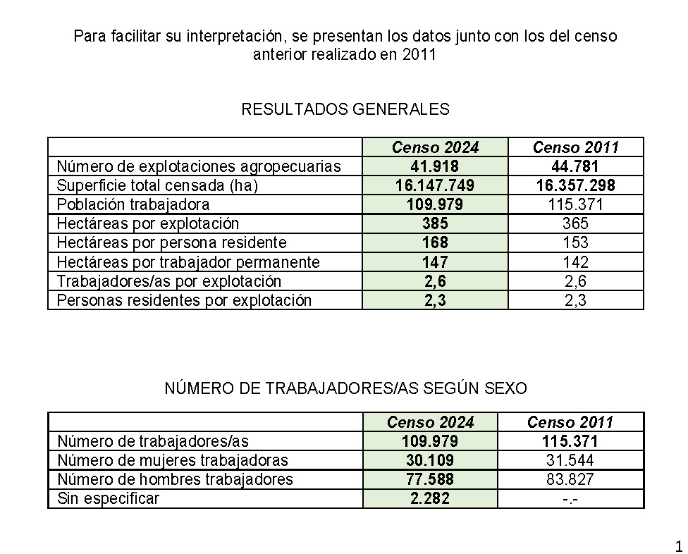 Por otro lado, se registran 109.979 trabajadores permanentes (2,6 por explotación), con un descenso de 31% en 40 años (en 1980 eran 159.446) y aumento de hectáreas por trabajador de 100 a 147, lo que da indicios de una mayor mecanización. Los residentes en los establecimientos rurales también caen 63% desde 1980, pasando de 264.216 a 96.069 personas, de 4 a 2,3 personas por explotación en promedio.