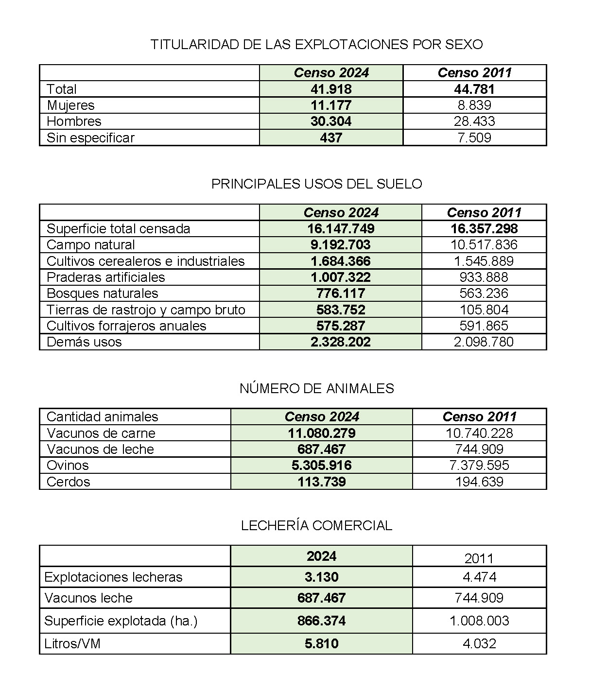 El Ministerio de Ganadería, Agricultura y Pesca del Uruguay presentó esta semana los resultados definitivos del Censo General Agropecuario 2024, que actualiza los datos de otra medición realizada trece años antes, en 2011. En ese lapso, el número de explotaciones se redujo un 6,4% y quedan 41.918 establecimientos que, con un tamaño promedio de 385 hectáreas. trabajan sobre 16,1 millones de hectáreas.