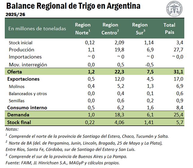 El récord de producción de trigo en la Argentina de 27,7 millones de toneladas en 2025/26 se explica por el crecimiento de la oferta en la región central del país, que aportó 19,8 millones de toneladas, un 58% más que en 2024/25.