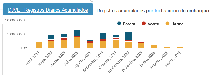 Los embarques argentinos programados de poroto de soja se interrumpieron en noviembre pasado y a partir de diciembre de 2025 sólo está prevista la exportación de harina y aceite de soja. La exportación de poroto recién se reinicia en abril de 2026 con el ingreso de la nueva cosecha 2025/26.