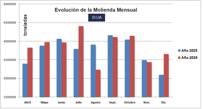 En diciembre pasado la molienda de soja en la Argentina –según datos oficiales– fue de 3,09 millones de toneladas, una cifra 15% inferior a la registrada en el mismo mes de 2024.