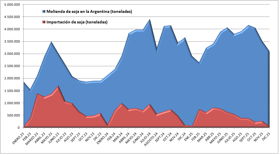 En diciembre pasado la Argentina importó 62.172 toneladas de poroto de soja en el marco del régimen de admisión temporaria, que provinieron mayormente de Paraguay y, en menor medida, de Uruguay. En los nueve primeros meses del ciclo comercial 2024/25 la participación de la soja importada en la molienda argentina fue del 12,1% versus 16,5% en el mismo período del año pasado.