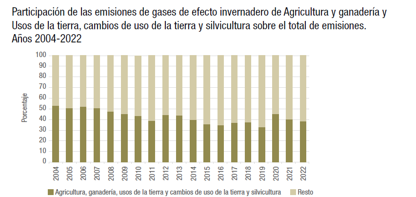 Los registros del 2022, de hecho, muestran que la relación es de un 60-40, o incluso mayor. El agro -entre ganadería, agricultura y cambios de usos de la tierra- ya no es responsable de la mitad de los gases de efecto invernadero emitidos, lo que probablemente no responda sólo a un descenso propio, sino a un incremento de otros sectores.