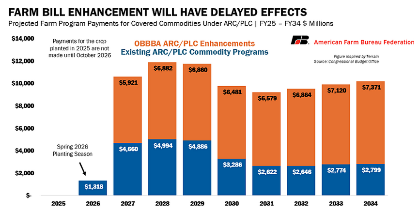 De todas maneras, la mayor parte del quebranto de este año será cubierto por subsidios extraordinarios aportados por el gobierno nacional. El incremento sideral de la ayuda a través de los programas ARC y PLC, entre otros, comenzará a instrumentarse con fuerza a partir de 2027, lo que garantiza que los productores de EE.UU. seguirán teniendo un “salvavidas” en caso de que, ante un cambio de gobierno, se corten los paquetes de ayuda extraordinaria para entonces.