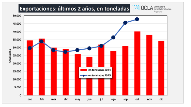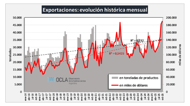 Las exportaciones de productos lácteos en Argentina han arrojado mejoras significativas durante los últimos meses y podrían alcanzar un nuevo récord al cierre de 2025. De acuerdo con los datos difundidos por el Observatorio de la Cadena Láctea (OCLA), hasta octubre el incremento en las ventas al extranjero fue de 8% en volumen y 20% en valor.