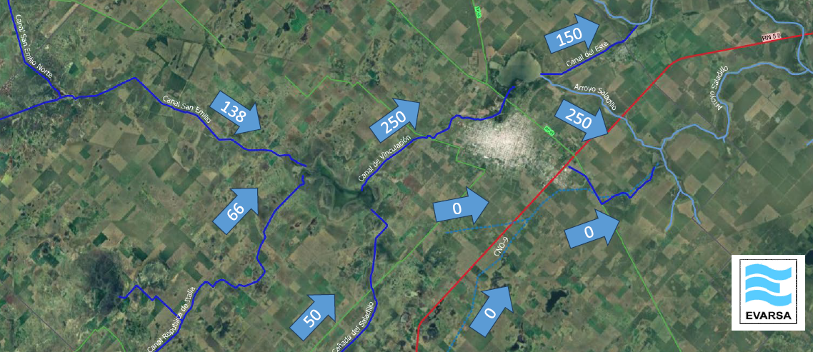 “Para tener una referencia, el río Salado a esa altura tiene un caudal de unos 400 metros cúbicos por segundo y aquí estamos proponiendo una obra que va a permitir escurrir 250 metros cúbicos; es muy relevante para toda la región productiva”, remarcó Tavecchio.