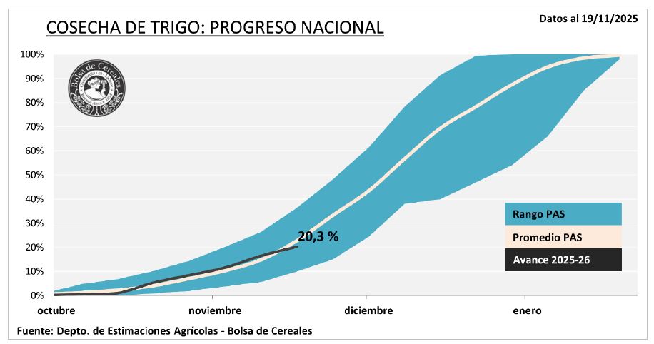 Ya se cosechó en la Argentina el 20% del área nacional de trigo para generar una oferta de 4,0 millones de toneladas sobre un total estimado de 24,0 millones.
