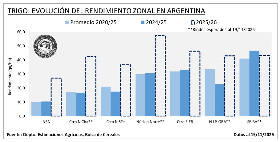 “El avance de la trilla continúa extendiéndose hacia zonas del centro del área agrícola, donde los resultados arrojan rendimientos promedio que superan máximos históricos”, apuntó la entidad porteña.