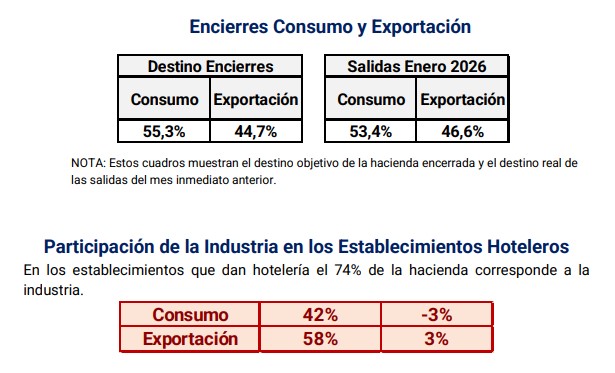Según sus datos, el 45% del total de hacienda encerrada es de estos frigoríficos, pero en los establecimientos hoteleros su participación llegó a 58%. Además en el último mes aumentó 3% mientras que la participación de los consumeros cayó 3% y fue de 42% sobre el total.