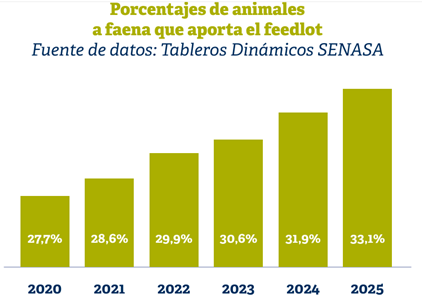 Pero al mismo tiempo, los feedlots muestran una participación creciente y sostenida en la oferta de animales destinados a faena. En 2025, el aporte de los corrales explicó el 33% de la faena total, frente al 32% en 2024 y al 30,6% en 2023.