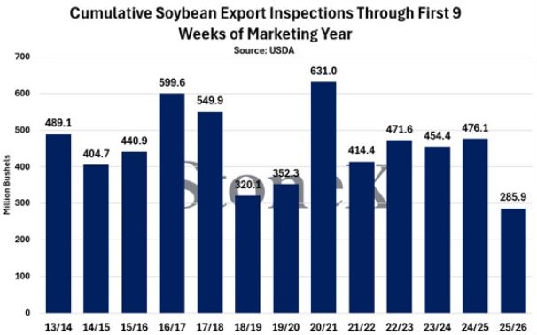 Los compromisos comerciales de soja estadounidense 2025/26 a la fecha suman 7,78 millones de toneladas, una cifra 40% inferior a la registrada en la misma fecha del año pasado y la más baja de la última década, según datos oficiales recopilados por la consultora StoneX.