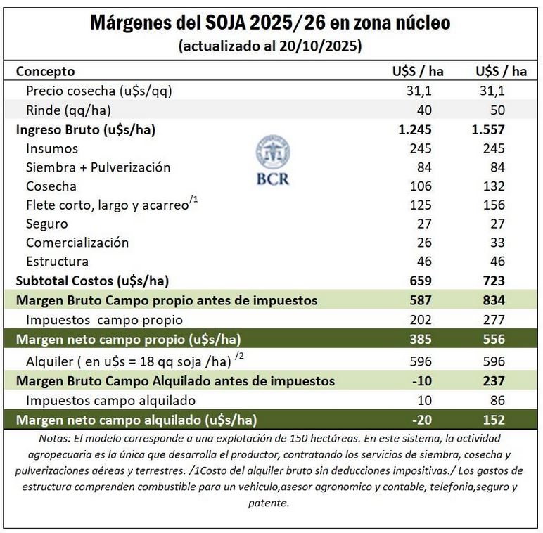La Bolsa de Comercio de Rosario (BCR) publicó un informe en el cual se muestra que el margen neto proyectado del cultivo de soja de primera 2025/26 de un planteo tecnológico estándar en la zona núcleo pampeana es de 385 u$s/ha en campo propio y -40 u$s/ha en campo arrendado.