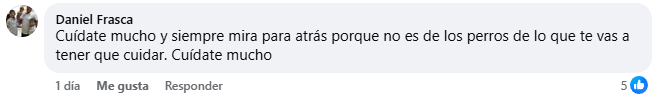 “Cuídate mucho y siempre mira para atrás porque no es de los perros de lo que te vas a tener que cuidar. Cuídate mucho”, le dijo el usuario Daniel Frasca por Facebook.