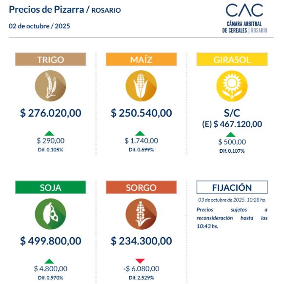 Este viernes el precio “pizarra” Rosario, publicado por la Cámara Arbitral de Cereales de Rosario en base a las operaciones realizadas ayer jueves, se ubicó en 499.800 $/tonelada y superó la referencia del mercado A3, que ayer terminó en un promedio de 495.000 $/tonelada.