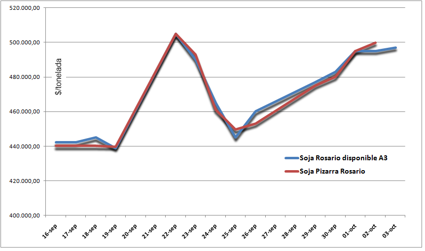 En tanto, el valor de referencia negociado este viernes, según A3, fue de 497.000 $/tonelada, una cifra que está muy cerca de los 505.000 $/tonelada logrados el pasado 22 de septiembre, cuando comenzó a regir el régimen de suspensión de retenciones que se dio de baja dos días después (24 de septiembre).