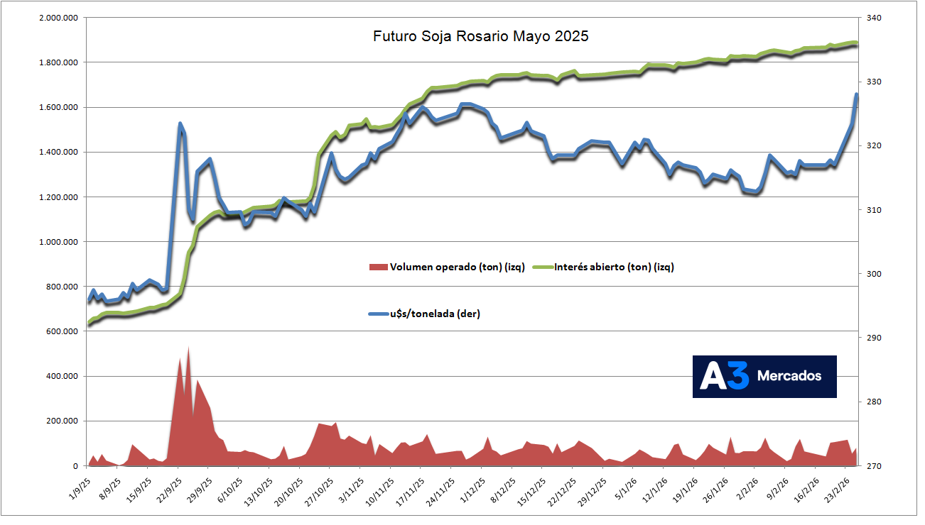 Sin embargo, hubo una nueva oportunidad con precios que empezaron a recuperarse: ayer miércoles el valor de la Soja Mayo 2026 terminó con un máximo de 328,1 u$s/tonelada y se operaron 79.000 toneladas con un interés abierto que descendió respecto del martes, lo que indica que muchos liquidaron posiciones para capturar márgenes.