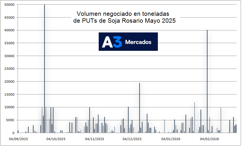 En lo que respecta a las opciones de venta (PUTs) del contrato Soja Rosario Mayo 2026, desde septiembre del año pasado a la fecha se negociaron 767.200 toneladas, las cuales se concentraron a fines de septiembre (suspensión de retenciones) y comienzos del presente mes de febrero.