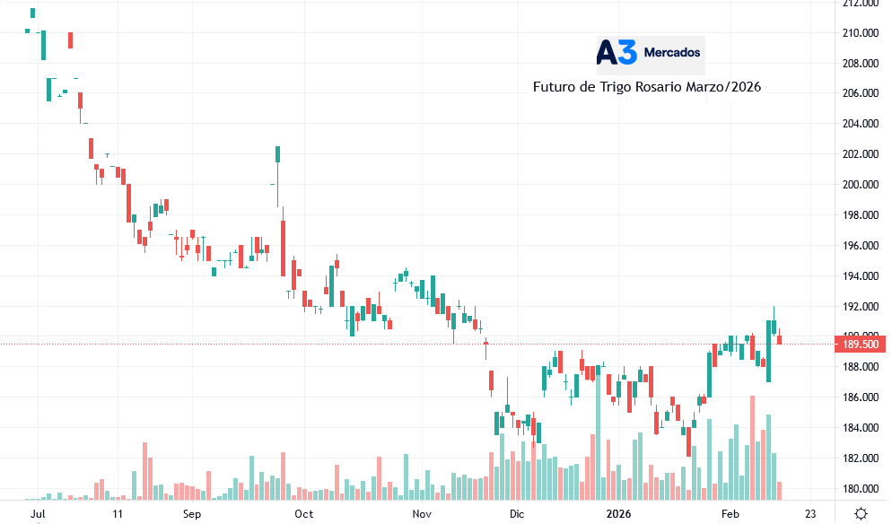 El último FAS teórico de trigo Rosario con embarque en marzo próximo publicado por la Bolsa de Comercio de Rosario muestra un valor FAS de 179,1 u$s/tonelada, mientras que el precio de cierre de ayer viernes de esa posición en el mercado de futuros A3 fue de 189,5 u$s/tonelada.