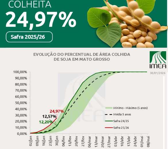 En Brasil ya se recolectó el 6,6% de la cosecha de soja e nivel nacional, el doble que el año pasado a esta altura, de acuerdo con la última información oficial publicada por Conab. El estado de Mato Grosso lleva la delantera con casi un 25% levantado al 30 de enero pasado.